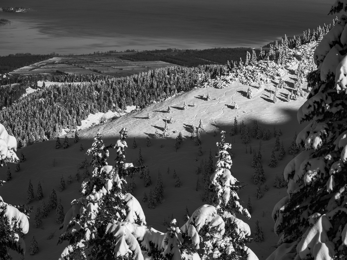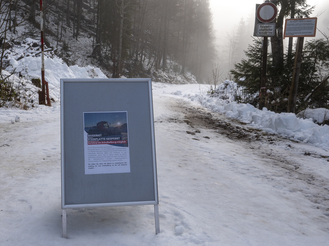 Vom Seegatterl-Parkplatz über die Talabfahrt auf den Scheibelberg. Alles pistenmäßig eingefahren, grenzwertig wenig Schnee am Kurvenlift! Ausflüge in den „Tiefschnee“ gilt es tunlichst zu vermeiden: Bruchharsch der übleren Sorte!