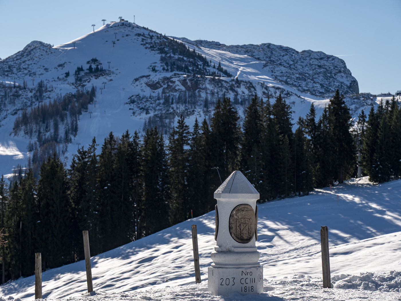 Von Hohenaschau mit vielen, vielen Gleichgesinnten entlang der – im oberen Bereich sogar schon teilweise gewalzten – Pisten bis zur Kampenhöhe. Unten sind die Wiesen gerade noch so halbwegs weiß, oben dann vielleicht bis zu 40 cm Schnee. Mit ’nem guten Ski noch nicht empfehlenswert, aber im Großen und Ganzen voll okay.