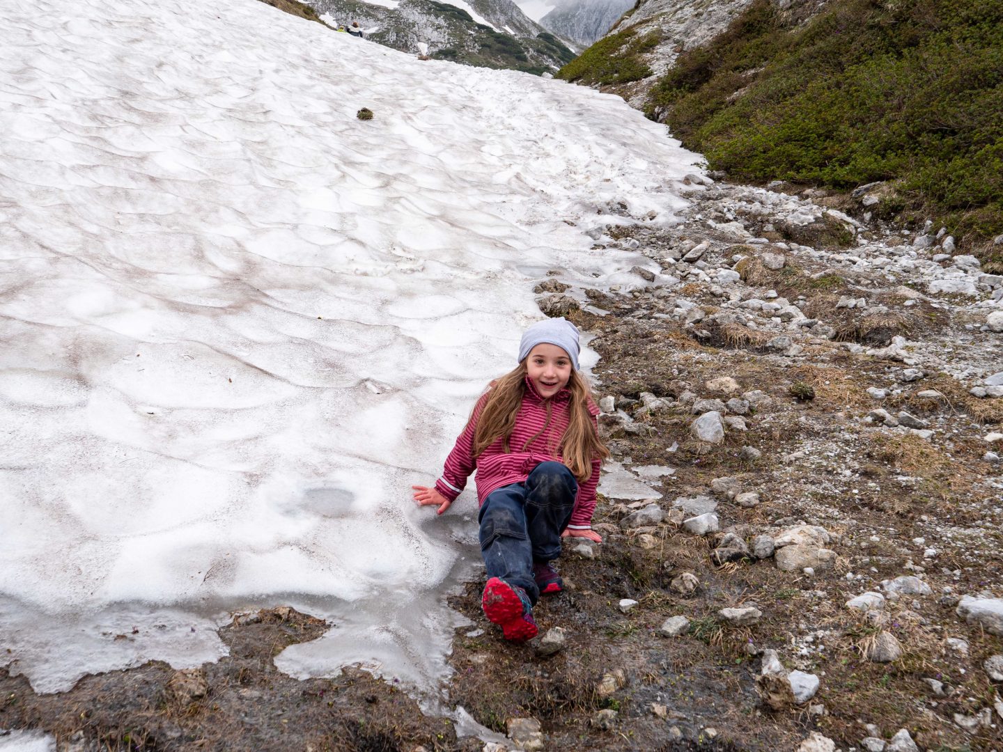Kurzentschlossen und randvoll mit Käsespätzle nach dem Mittagessen auf den Fritzer. Der Abstieg dauert dank des gut rutschbaren Altschnees keine halbe Stunde.
