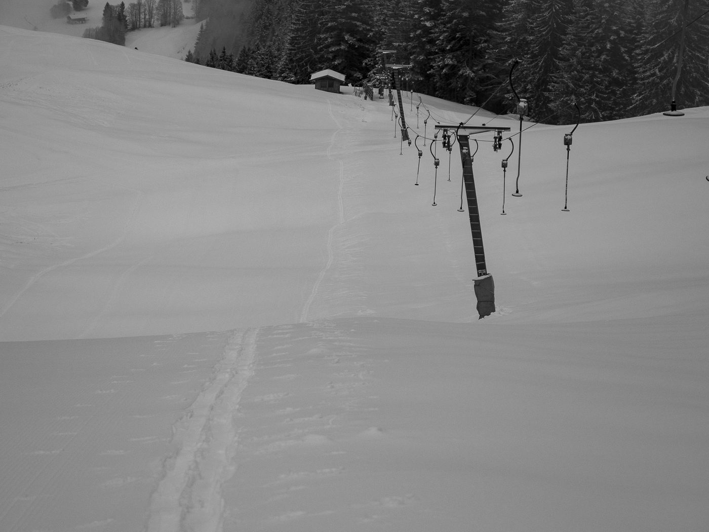 Entgegen der Monotonie heute – zum ersten mal in diesem Winter – im Heutal unterwegs. An Sonntagshorn oder ähnliches ist aber nicht zu denken. Somit geht es „nur“ am Pistenrand aufwärts. Der Schneefall der Nacht war leider nur kosmetischer Natur, mehr als 3 oder 4 Zentimeter sind leider nicht zusammengekommen. Man wird genügsam…